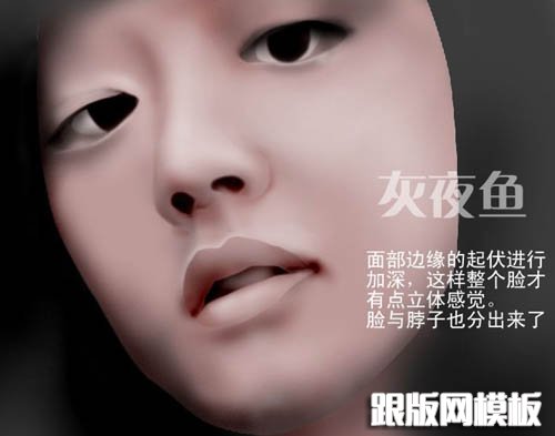 11、用加深工具对面板边缘的起伏进行加深,这样整个脸才有点立体感。脸与脖子也分出来了。