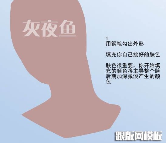 1、新建一个大小适当的文档,用钢笔勾出外形,填充你自己调好的肤色,肤色很重要,你开始填充的颜色将主导整个后期加深减淡产生的颜色。