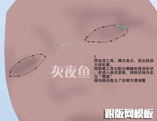 2、用加深工具,模式高光,突出脸部大体轮廓。用钢笔工具勾勒出眼睛的具体形状,并进入路径面板,将路径保存为“眼部”,保存路径是为了后期方便调整。