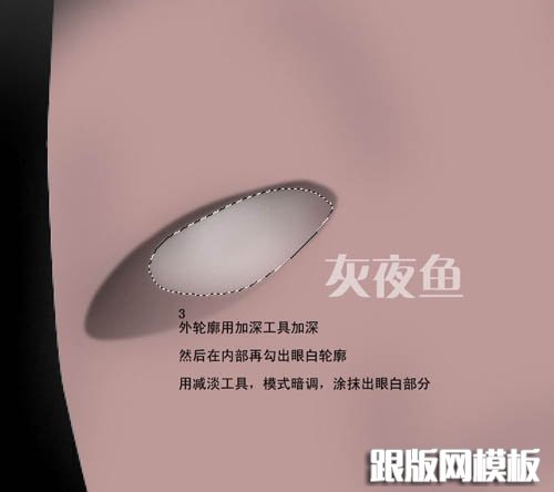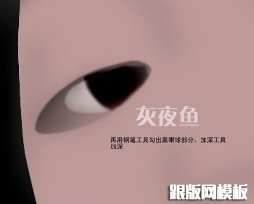 3、外轮廓用加深工具加深,然后在内部再勾出眼白轮廓,用减淡工具,模式暗调,涂抹出眼白部分。