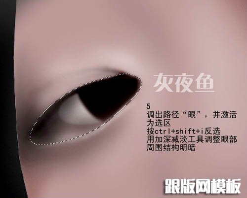 5、调出眼部的路径,并激活为选区,按Ctrl + Shift + I 反选,用加深/减淡工具调整眼部周围结构明暗。