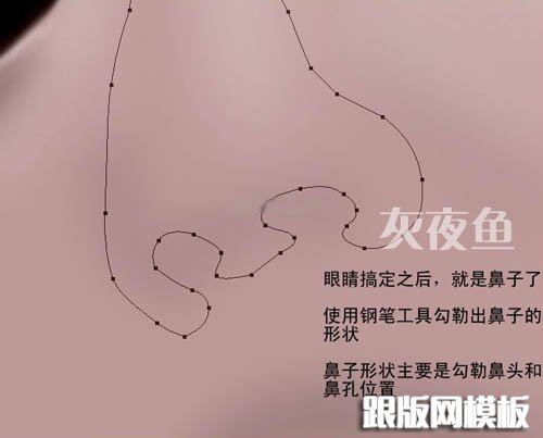 7、眼睛做好后就是鼻子了,使用钢笔工具勾勒出鼻子的形状,鼻子形状主要是勾勒鼻头和鼻孔位置。