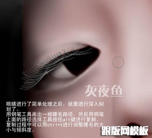 12、眼睛进行了简单处理之后,就要进行深入刻画了。用钢笔工具画出一根睫毛路径,然后用钢笔上面的路径选择工具按住Alt键进行复制。复制过程中可以按Ctrl + T 进行调整睫毛的大小与倾斜度。