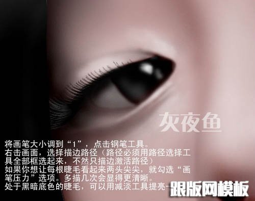 13、将画笔大小调到1,点击钢笔工具右击画面,选择描边路径(路径必须用路径选择工具全部框选起来,不然只描边激活路径),如果你想让每根睫毛看起来两头尖尖,就勾选“模拟压力”选项,多描几次会显得更清晰。处理黑色底色的睫毛,可以用减淡工具提亮一点。