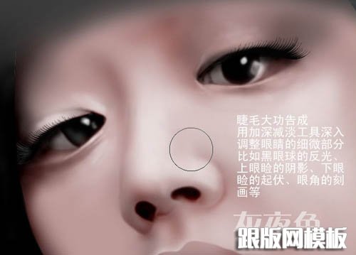 14、睫毛做好后,用加深/减淡工具深入调整眼部的细微部分,比如黑眼球的反光、上眼睑的阴影、下眼睑的起伏、眼角的刻画等。