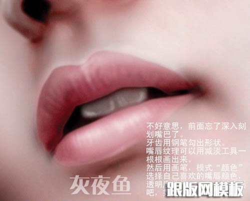 15、牙齿用钢笔勾出形状,嘴唇纹理可以用减淡工具一根根画出来。然后用画笔,模式“颜色”,选择自己喜欢的嘴唇颜色,透明度选择:10%,开始画,效果如下图。