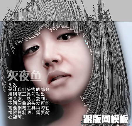 16、头发部分的制作:用钢笔工具勾勒出一个头发,然后复制不同弯曲的头发,可能需要钢笔工具再勾勒,慢慢复制吧,需要耐心。