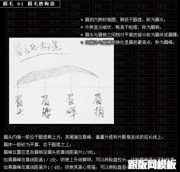 本教程详细介绍眼睛的构造、特点及鼠绘方法。总的来说眉毛的制作没有头发及睫毛那么复杂。不过也不能小视。因为眉毛也是面部比较重要的部分。 最终效果一、眉毛的构造。 眉毛由眉头、眉腰、眉峰、眉梢等四部分构成。 眉头内端一般位于眶缘稍上方...