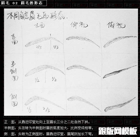 半侧面:头在转为半侧面时眉的弧度加大,比例变成相等。