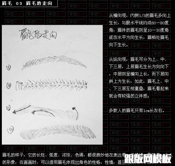 从横向观,内侧1/3的眉毛多向上生长,与眼水平线约成60 - 80度角,眉体的眉毛则呈10 - 30度角或在水平方向生长,眉梢处眉毛向下生长。