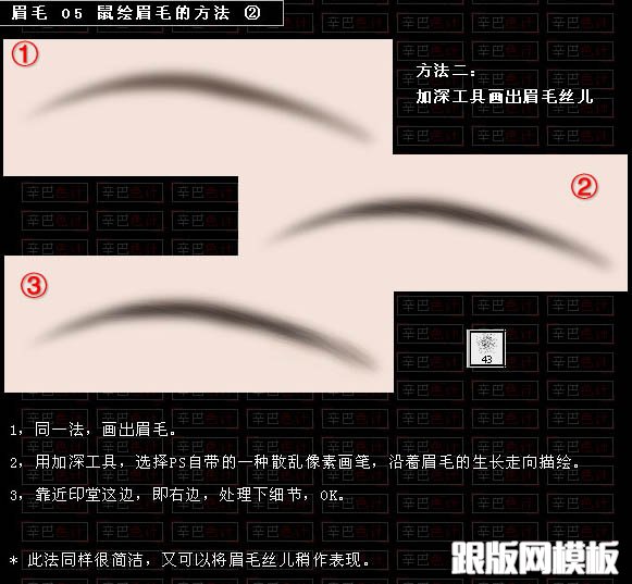 2、用加深工具,选择PS自带的一种散乱像素画笔,沿着眉毛的生长走向描绘。