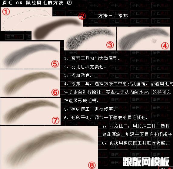 4、选择涂抹工具,选择方法二中的散乱画笔,沿着眉毛的生长走向进行涂抹,要点在于内向外涂,这样可以在边缘形成毛根。