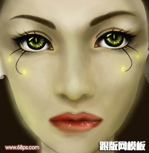 5、这步好像快了点。眼睛的高光很重要,有神没神就看它了,其实我有时也拿捏不好,会一直尝试。这时候低透的橡皮是我的最爱,或者用淡色打底,再用减淡工具点出最亮的地方。触须下面的发光体比较方便,画泪珠状,再侧面画一点点白色,用有模糊外圈的画笔(大点)点几下就行。