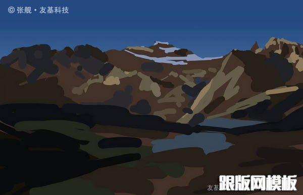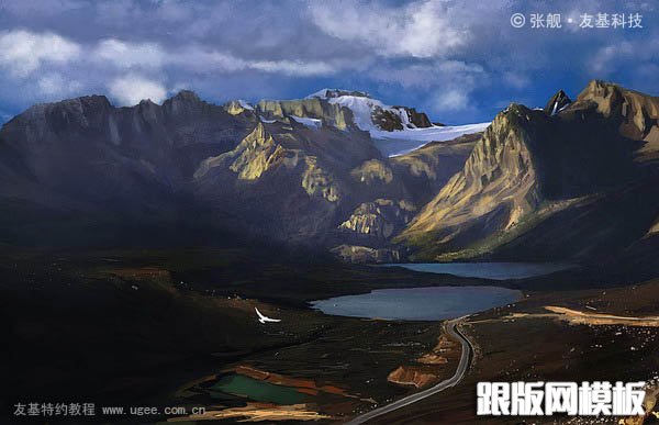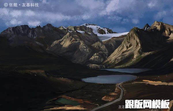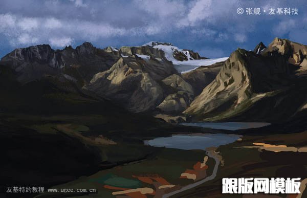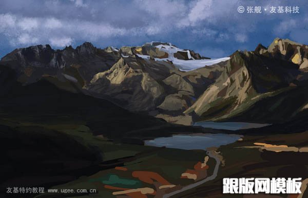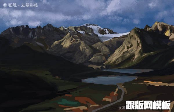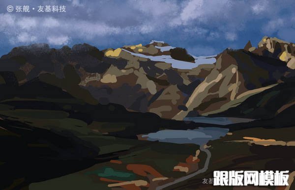 4、在上一步的基础上继续丰富一些调子和色彩。注意:这期间要同时兼顾下山体形态,但不用太精确,因为山体在新的图层上,修改比较方便。