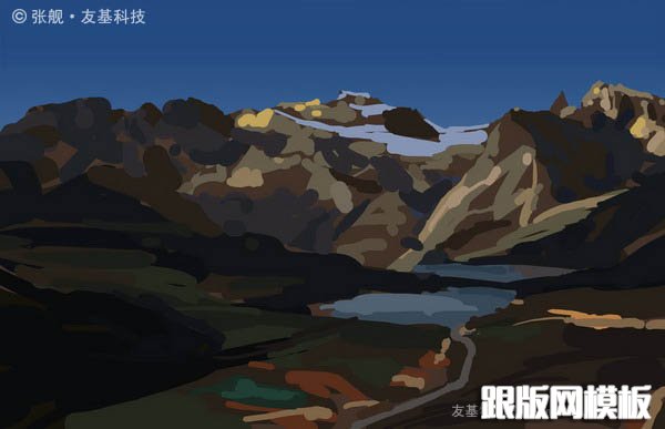 8、使用同样的方法开始刻画其它山头。画结构分明的自然界如山、石等,可以选用带有质感的平头笔刷。