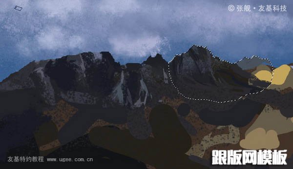 7、开始具体刻画山体。我习惯从山头开始,还是使用套索工具,用带有材质的笔刷开始对山头一个个刻画,这个过程要有耐心。
