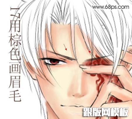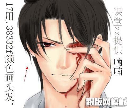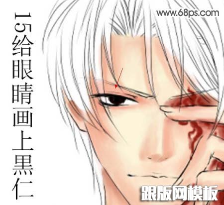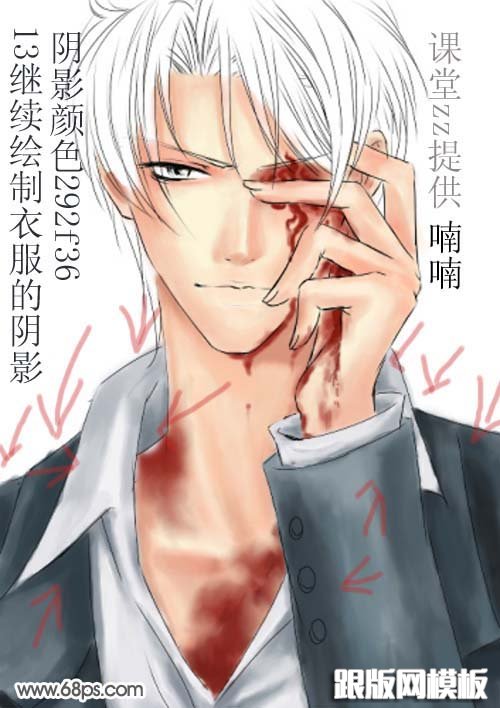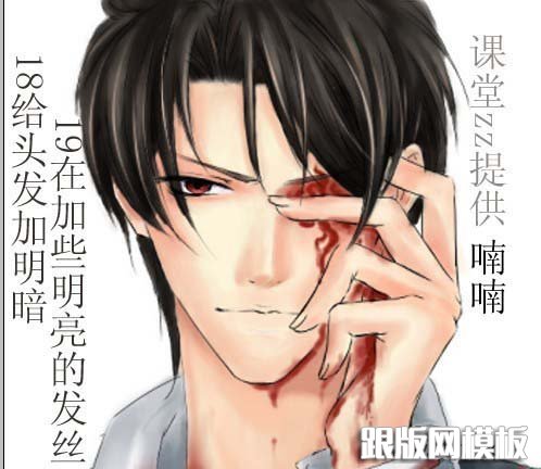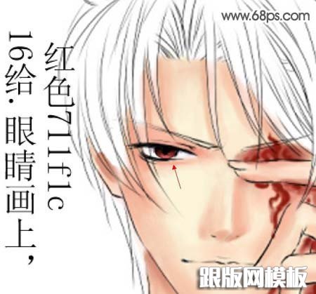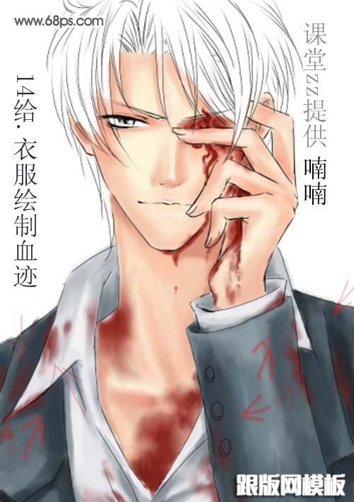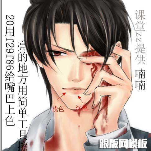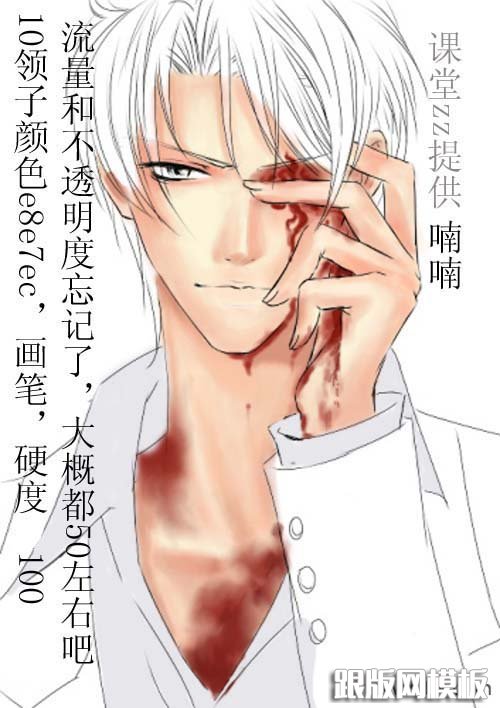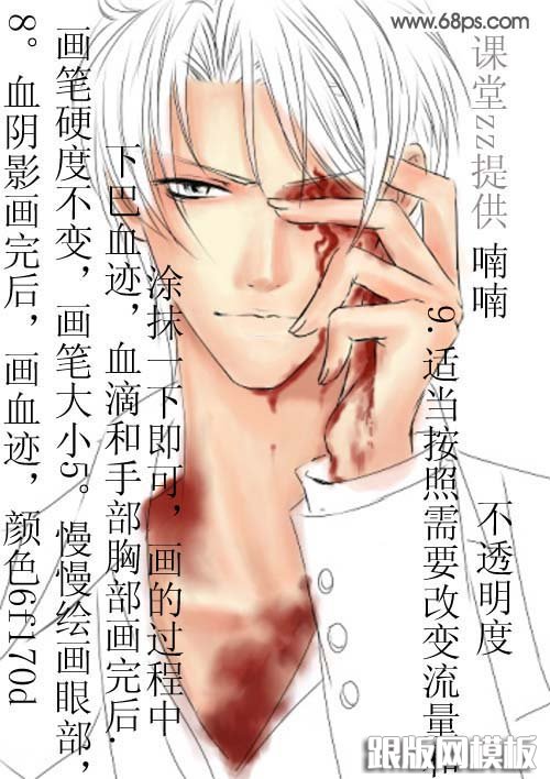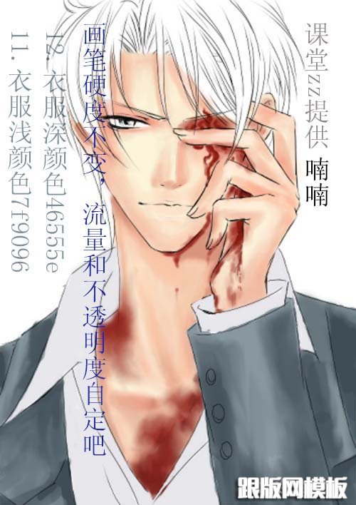 8,9、血阴影画完后,画血迹,颜色:#6f170d。画笔硬度不变,画笔大小5,慢慢绘画眼部,下巴的血迹。血滴和和手部胸部画完后。涂抹一下即可,画的过程中,适当按照需要改变流量和不透明度。