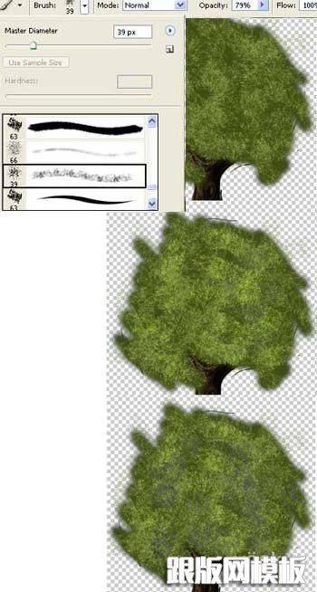 11、选择橡皮擦工具,选择下图左上角的自然笔刷形状,在树冠边缘擦出自然的状态,如下图。