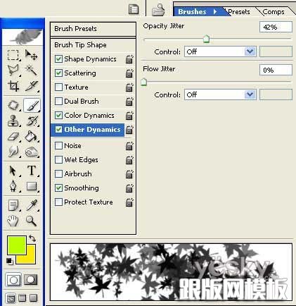 14、选择树叶形状的笔刷,做下图设置。并选择前景色为亮绿色,背景色为深黄色。