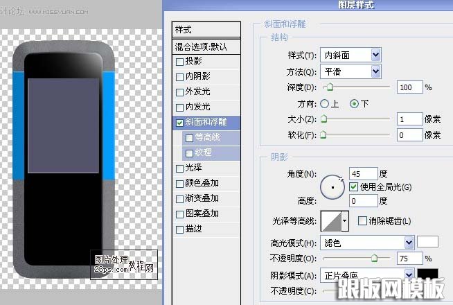 4、新建一层,画出手机屏幕,添加斜面浮雕效果,如图;