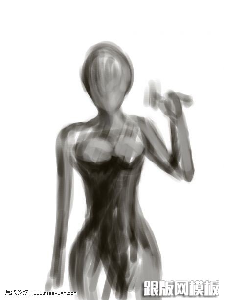 1、先从整体出发,用色块把人物的姿势大概的表现出来,用黑白灰体现出明暗关系。这个过程需要快速果断,不要考虑细节。.只须把脑海中的画面尽可能表现准确就行了。