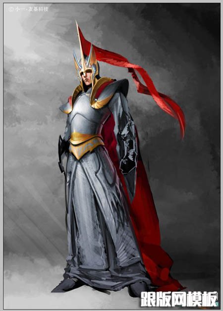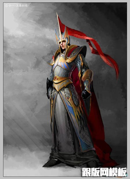 5、只有金色的话,整体的色阶变化没拉开,所以我决定用红色来点缀下画面。部位就设定在头顶和披风上,头顶上是红色,是为了在实际游戏环境里运动起来的红色飘带将会很吸引人的眼球,而红色斗篷色是更好的衬托出人物本身的外轮廓。