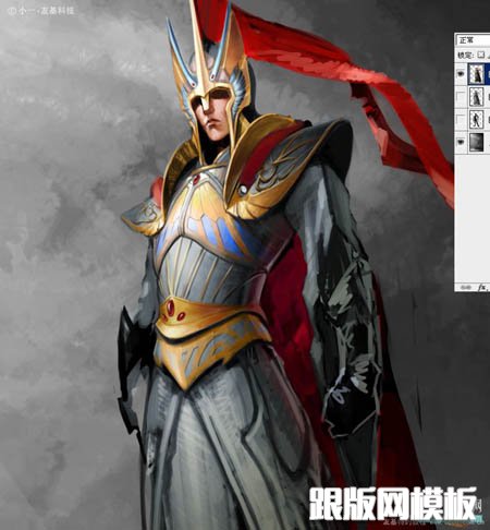 3、大概的形式确定了,接下来就进行具体的绘制了。他的盔甲我定位比较光滑的金属类型,所以抓住金属的感觉 强烈的高光和反光,在这个基础上根据盔甲具体的几何形状来描绘。多利用吸管工具,吸取临近颜色结合压感笔的压力感应来进行过渡。