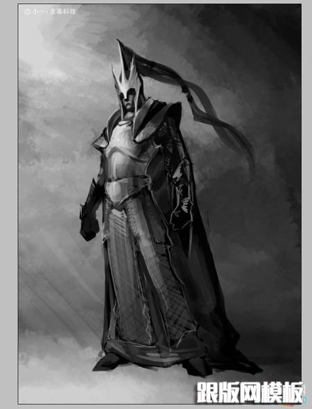 2、当前期准备工作完成后,就要着手进行服饰的设计了。这一步先大概的区分出盔甲的分布形式,我是将它先分为头盔,肩甲,胸甲,护手,裙甲等大的部分。现阶段只要绘制出大概的明暗关系就可以了。