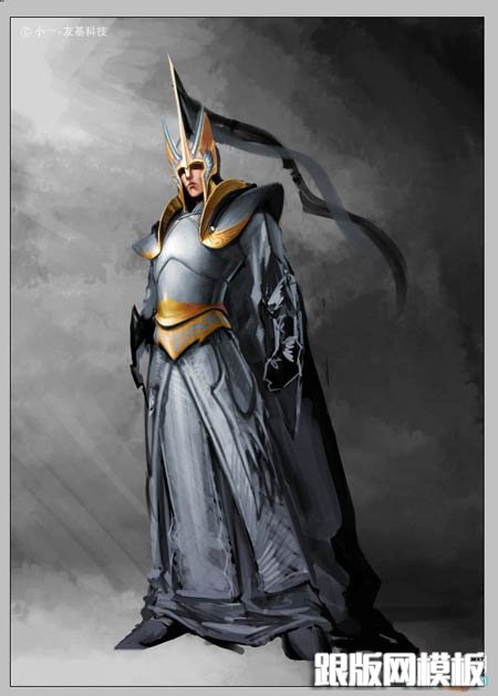 4、素描关系确定了,现在还是为盔甲分色,为了显示出职业的高级别,我选用金色来进行装饰。在领部,肩甲边缘 和腰际用金色分隔开。这样的好处是可以很清晰的让人分辨出各个部位。这里要注意同样是金色,但是由于光和环境的影响所产生的颜色变化。
