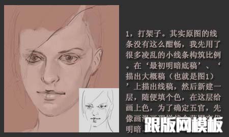 1、打架子,其实原图的线条没有这么酣畅,我先用了很多凌乱的小线条构筑比例。在最初明暗底稿描出大概稿,然后新建一层,随便填个色,在这层给画上色,为了确定五官,先像画漫画那样找个范围交代明暗。