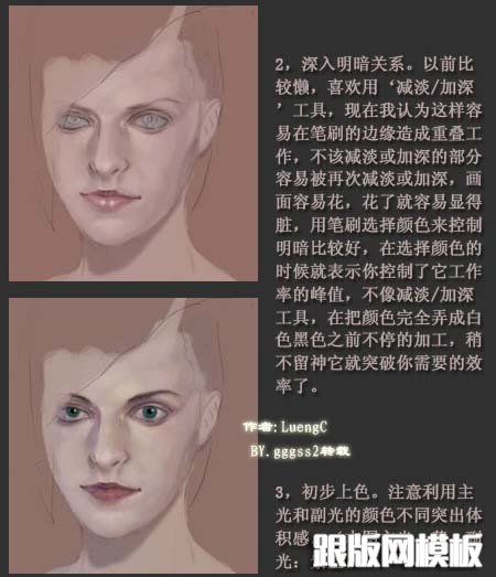2、深入明暗关系。以前比较懒,喜欢用“减淡/加深”工具,现在我认为这样容易在笔刷的边缘造成重叠工作,不该减淡或加深的部分容易被再次减淡或加深,画面容易花,花了就容易显得脏,用笔刷选额颜色来控制明暗比较好,在选择颜色的时候就表示你控制了它工作率的峰值,不像减淡/加深工具,在把颜色完全弄成白色黑色之前不停的加工,稍不留神它就突破你需要的效率了。