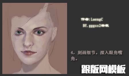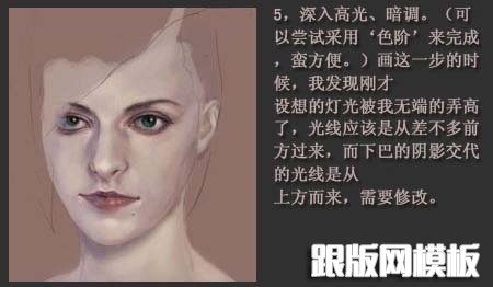 5、深入高光、暗调。可以尝试采用色阶来完成。画这一步的时候,我发现刚才设想的灯光被我无端的弄高了,光线应该是从差不多前方过来,而下巴的阴影交代的光线是从上方而来,需要修改。