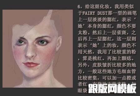 6、化妆,选择一款好的化妆画笔上一层淡淡的腮红,颜色不要太粉。然后上一层雀斑,之后再上一层腮红,这一层则颜色不用天然,我用了比较重的粉。再加上颗痣。另外皮肤皱折比较多的地方,一般这些地方毛细血管比较密集,可以加一点橙或则红。有些地方的皮肤,如眼袋,血管颜色偏青。