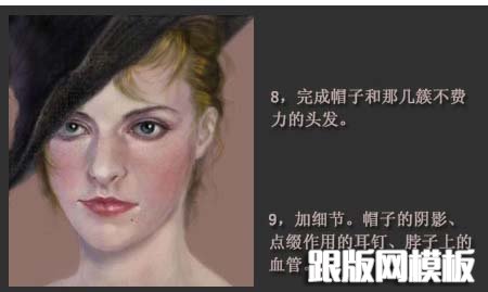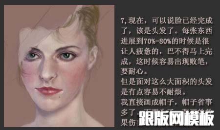 7、现在,可以说脸部已经完成了,该是头发了。每张东西进展到70% - 80%的时候是很让人疲惫的,巴不得马上完成,这时候容易出现败笔,要耐心,大师面对这么大面积的头发是有点容易不耐烦。我直接画成帽子。