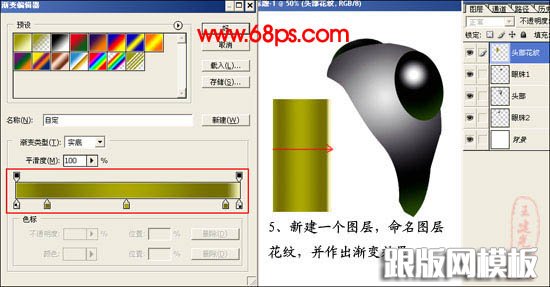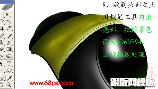 8、把花纹图层放到头部之上,用钢笔工具勾出亮部,把前景色设为:#D6DF94,进行描边路径。