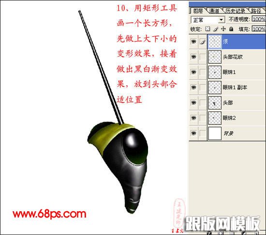 10、用矩形工具画一个长方形,先做上大下小的变形效果,接着做出黑白渐变效果,放到头部合适位置。
