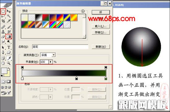 1、新建一个800 * 800像素文件,用椭圆选框工具拉一个正圆,选择渐变工具,颜色设置为黑白渐变如下图左,拉出下图右的径向渐变效果。