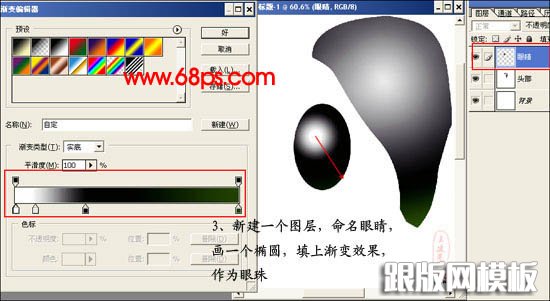 3、新建一个图层,命名为“眼睛”,画一个椭圆,填充渐变效果作为眼珠。渐变设置及效果如下图。