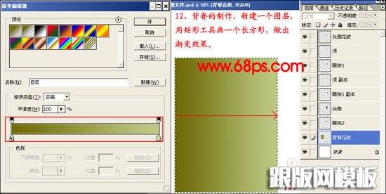 12、背脊的制作,新建一个图鞥,用矩形选框工具拉一个长方形,然后拉上渐变色。颜色设置及效果如下图。
