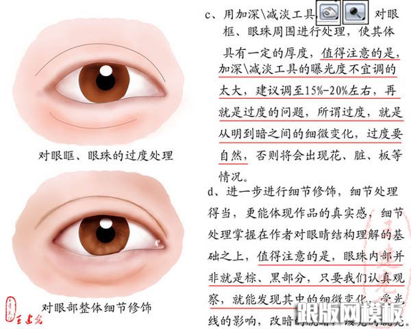 C、用加深/减淡工具对眼眶、眼珠周围进行处理,使其体具有一定的厚度,值得注意的是,加深/减淡工具的曝光度不宜调太大,建议调至:15%--20%左右,再就是过度的问题,所谓过度,就是从明到暗之间的细微变化,过度要自然,否则将会出现花、脏、板等情况。