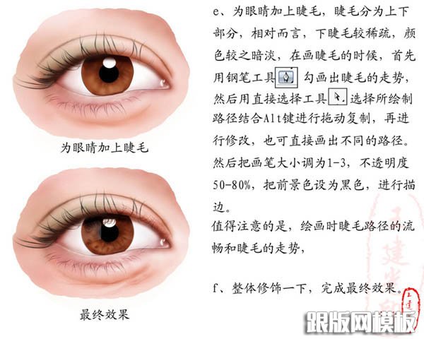 E、为眼睛加上睫毛,睫毛分为上下部分,相对而言,下睫毛较稀疏,颜色较之暗淡,在画睫毛的时候,首先用钢笔工具勾画出睫毛的走势,然后用直接选择工具选择所绘制路径结合Alt键进行拖动复制,再进行修改,也可直接画出不同的路径。然后把画笔大小调为1-3,不透明度50-80%,把前景色设为黑色,进行描边。值得注意的是,绘画时注意睫毛路径的流畅和睫毛的走势。