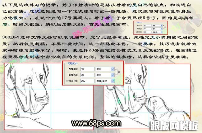 1、新建一个40 * 30厘米,分辨率为300的文件,大些的文件可以表现细节,拉几条参考线,来确定大小狗狗之间的位置,然后起稿,不要怕乱费时间,这一步马虎不得,一定要准,技巧是没有的,就看大家平时是不是勤奋了。