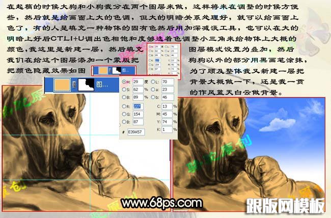 我这里是新建一层,然后填充颜色:#E39A57,把图层混合模式改为“叠加”,然后我们再给这个图层添加一个蒙版,把狗狗以外的部分用黑色画笔擦掉。为了顾及整体,我又新建一层把背景大概做一下,还是一贯的作风蓝天白云做背景。