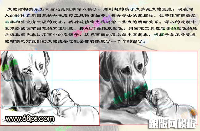 本教材介绍较复杂的动物鼠绘方法。从效果图可以看出狗身上有很多皱纹,而且皮毛部分非常细致柔和。鼠绘的时候需要一定的耐心和技巧。