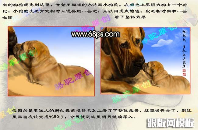 7、大狗我先画到这里,开始用同样的方法画小狗。在颜色上跟大狗有一个对比,小狗的皮毛稍微嫩一点,所有用浅色,皮毛相对柔和一下如下图。