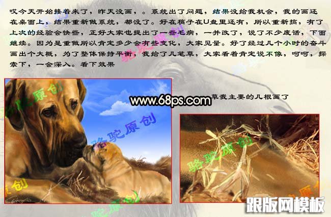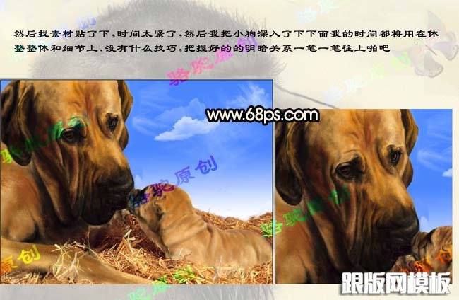 9、找一些草素材贴上去,然后我把小狗深入了一下,我把时间都用在修正整体和细节上,没有什么技巧把握好明暗关系一笔一笔画。