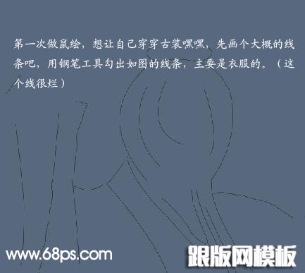 1、新建一个大小自定的文件,背景填充颜色:#58687F,新建一个图层,用钢笔工具勾出下图所示的轮廓效线。