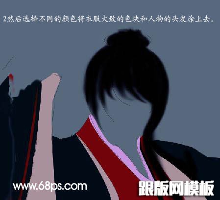 2、选择不同的颜色将衣服大致的色块和人物头发涂上。
