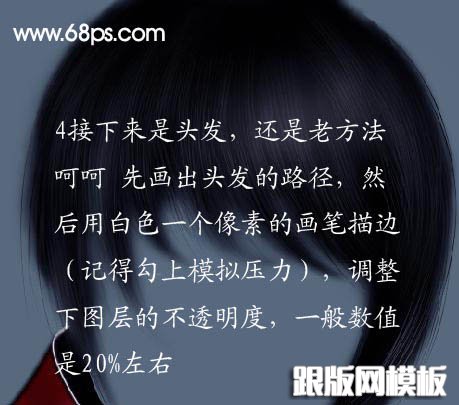 4、接下来是头发,还是老方法,先用钢笔勾出头发的路径,然后用白色1像素画笔描边路径,勾选模拟压力,调整下图层的不透明度,一般数值为:20%左右。