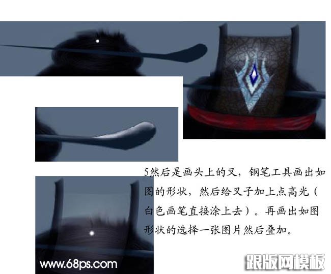 5、画头发上的饰物,用钢笔工具勾出下图所示的形状,转为选区后填充黑色,然后加上高光(用白色画笔直接吐上去)。再画出如下图的形状,填充颜色后用花纹图案叠加。